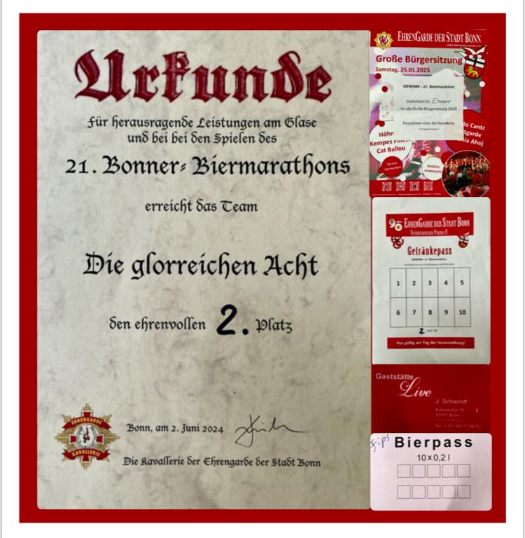 Wer denkt, Karneval habe nichts mit Kunst zu tun, wurde am 2.6.2024 beim 21. Biermarathon der Kavallerie der Bonner Ehrengarde eines Besseren belehrt. Mit einem hervorragenden Platz 2 konnten dem Team der KG Weiß-Blau Kessenich nur wenige das Wasser äh Bier reichen.